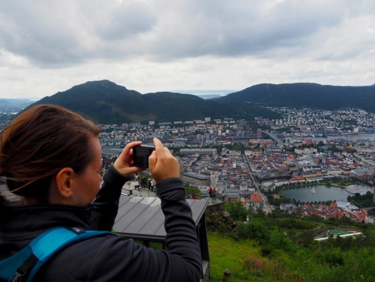 Les premiers efforts sont pour remonter la ville, toujours en traversant Bryggen et ses maisons dans les ruelles. La vue est de plus en plus belle au fur et à mesure que notre rythme cardiaque s'accélère avec la grimpette.