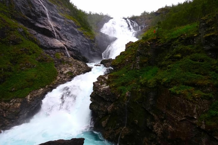 Les panoramas se succèdent lors de notre passage sur la ligne emblématique, mais s'il fallait décrire un passage, ce serait celui devant la cascade de Kjosfoss. Le train propose un stop de 5 minutes, où tous peuvent descendre des voies pour aller voir de plus prêt une cascade, il est vrai, impressionnante de puissance.