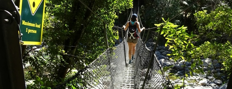 La randonnée se fait bien, c'est magnifique mais ça grimpe de plus en plus, ça finit par de l'escalade. Il fait 30 degrés, on peine un peu de la chaleur mais on a apporter le plein d'eau! Il y a plusieurs ponts suspendus, j'arrive à les franchir sans trop de mal, malgré le vertige. Apparemment c'est loin d'être les pire de NZ, ça me rassure !! La vue y est magnifique. Ca y est nous découvrons les premiers paysages!