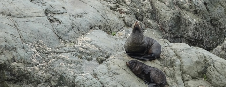Sur la route, premiers arrêts pour observer une colonie (assez impressionnante) d'otaries à fourrure, c'est super, elles sont toutes sur des rochers ou entrain de jouer dans l'eau, en tout cas elle font la pause pour les photos !! Le temps n'est pas terrible, nous continuons donc jusqu'à Kaikoura, ou enfin, le soleil refait son apparition ! Petit tour dans cette ville, que j'ai beaucoup aimée, et nous allons à l'office du tourisme afin de nous renseigner sur les compagnies pour aller voir les baleines mais décidons finalement de réserver sur internet car il y a une offre. Nous les verrons donc via le ciel, grâce à AIR kaikoura qui nous permet 40 min de vol et de voir les baleines en entier (contrairement à la vision par bateau). Réservation faite pour le lendemain ! En attendant, nous faisons une petite randonnée de 3h00, qui longe les bords de côtes et la plage, très sympa avec de superbes paysages et nous passons encore au milieu d'une colonie d'otaries, on a même vu un petit pingouin (ce n'est pas vraiment la saison ..).
