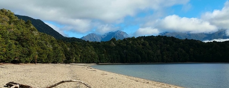 C'est avec Immanuel et Elio que l'on prend un petit bateau à 10h, laissant Simeon avec Christophe, au vu de l'expérience des 3h pour 7 km dans le Parc Abel Tasman avec Simeon une semaine plus tôt! Après avoir traversé le lac en 7 minutes à toute vitesse, on est débarqués sur une jolie plage, par temps encore gris mais qui va laisser place à un généreux soleil! La balade dans la forêt est superbe, les deux compères marchent devant, me laissant tout loisir de contempler des arbres majestueux, et écouter les mélopées des oiseaux.