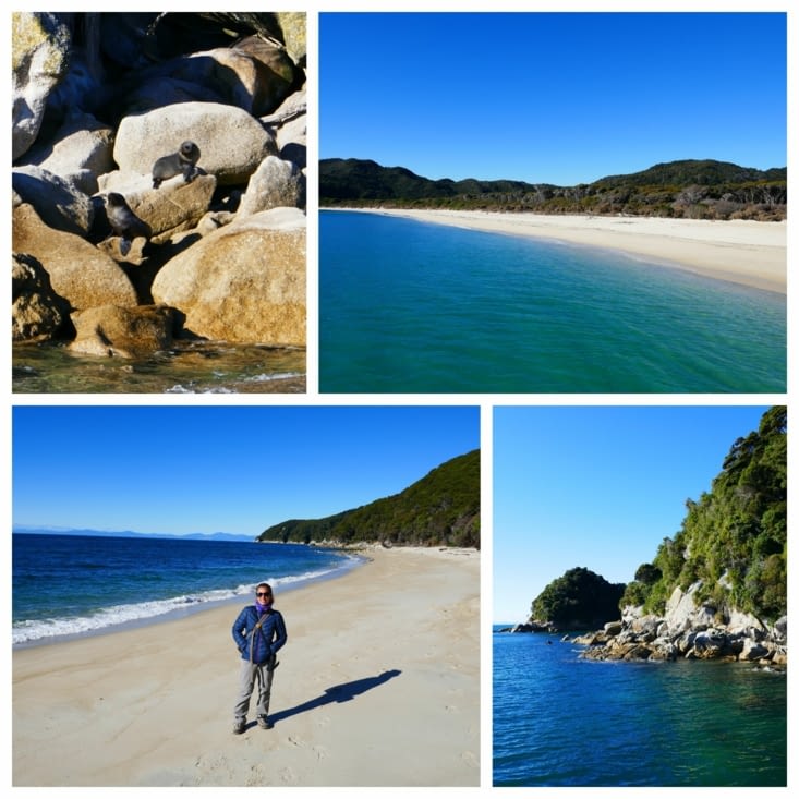 Après la ferme, nous nous dirigeons vers Abel Tasman pour deux jours. C'est un parc national à visiter à pied ou en kayak (la voiture y est interdite). C'est ainsi la région la plus ensoleillée de Nouvelle Zélande et ça ne manque pas, on a du soleil! Par contre, c'est aussi la région la plus touristique DONC la plus cher! On hallucine devant les prix de la location de Kayak (plus de 100 dollars par personne!), on revoit nos plans et on visitera alors cette région à pied et en bateau (bien moins cher).