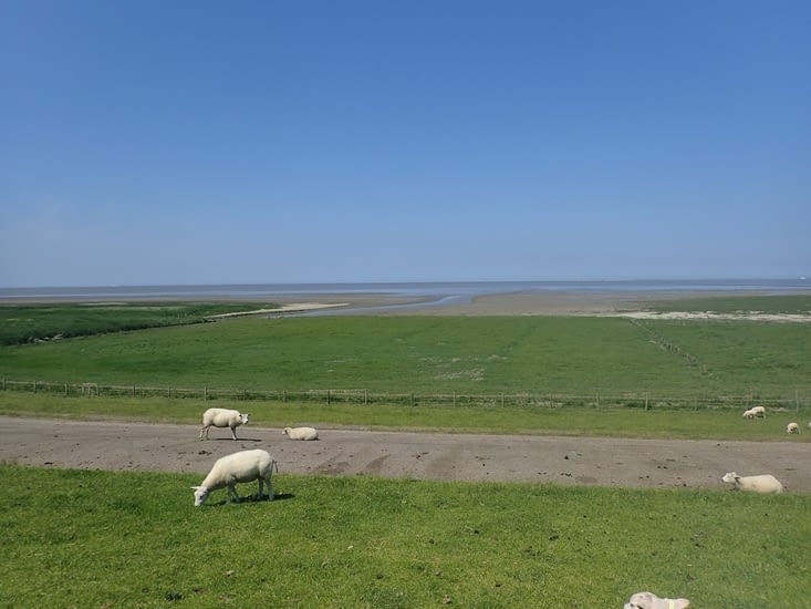 Comme beaucoup d'agriculteurs frisons, ils sont propriétaires d'une éolienne installée à quelques mètres de la maison. Il y en a énormément ici et beaucoup se construisent encore. Impossible de lever les yeux sans en apercevoir, il y en a des forêts. Nous discutons avec eux de l'intérêt de ces installations, de leur rentabilité, des contraintes, de leur bilan environnemental. Leur conclusion est sans appel, les éoliennes sont une bonne chose. Quant à nous, même si pensons qu'elles doivent bien sûr être implantées avec discernement, leur installation nous semble préférable en tout cas à la prolifération des centrales nucléaires. Nous avons passé la nuit à l'ombre des pales de la machine sans avoir en rien été gênés par le bruit que certains disent pourtant insupportable. Pour le Flamand que je suis, les éoliennes ne sont pas sans ressemblance avec leurs ancêtres les moulins. Je me demande si leur implantation suscitait les mêmes débats à l'époque.Bien qu'il ait été annoncé assez fort, n'avons pas eu de vent aujourd'hui. Tout au plus un petit courant d'air qui maintient des températures agréables. La journée aura été calme et ensoleillée. Un temps idéal pour rouler.Nus traversons le village de Zurich – un homonyme, nous sommes bien sur notre itinéraire, la très belle ville d'Harlingen.Nous pique-niquons dans un village où un habitant prévenant a installé tables et bancs mais aussi une petite cabane où il possible de se servir une boisson fraiche ou chaude – ce sera café pour nous -, d'emprunter une pompe et même – au cas où la pluie vous surprendrait de d'acheter un poncho plastique pour un euro.La journée est dominée par deux couleurs : le vert et le bleu. Le bleu du ciel. Le vert de l'herbe qui pousse sur la digue qui sépare la mer des Wadden, qui commence ici et s'étend au large de l'Allemagne et du Danemark, des terres en contrebas, du polder qu'elle protège. Par l'éminence qu'elle crée, la digue structure le paysage et définit l'horizon. D'en bas où nous roulons, nous ne pouvons rien supposer de ce qu'elle cache. Elle dessine une ligne horizontale qui sépare le vert du bleu. Tout au plus quelques moutons en découpant le paysage de leur silhouette viennent rompre cette harmonie parfaite. L'ambiance est silencieuse. Les seuls bruit qui parviennent sont ceux de la nature : les bêlements des moutons et les cris des oiseaux. Nous croisons au fil de la journée sans doute plus de vélos que de véhicules à moteur.Les gens d'ici ont des coutumes qui leur sont propres. Bien qu'ils ne soient qu'une vingtaine de milliers, ils parlent, en plus du néerlandais et du frison, leur propre langue, le blidts. Terre de mission pour l'espéranto !Toute la journée nous accompagnent aussi l'odeur des vaches et celle de l'herbe coupée. On vient de couper l'herbe des bas-côtés d'une grande partie des routes et des pistes et les agriculteurs ont fauché les pâtures, et profitant d'une météo favorable, s'apprêtent à rentrer les foins.Nous logeons ce soir dans un camping très agréable. La gérante, voyant que nous n'en n'avions pas, est même allée chercher une table et deux chaises qu'elle a mises à notre disposition. Nous avons même l'électricité !