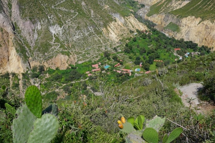 Ensuite, nous formons les groupes : un couple d'Hollandais (Herman et Johana) et un jeune British de 20ans nous accompagnerons pendant ces 3 prochains jours. et c'est par une descente vertigineuse de 8km que nous nous engageons dans le 3ème canyon le plus profond du monde. Ca nous rappelle un peu la route de la mort et progressivement la végétation se densifie pour devenir tropicale. Fernando, notre guide, prend le temps de nous instruire sur la flore et la géologie locale et c'est dans un petit village à flan de falaise que nous finissons notre journée.