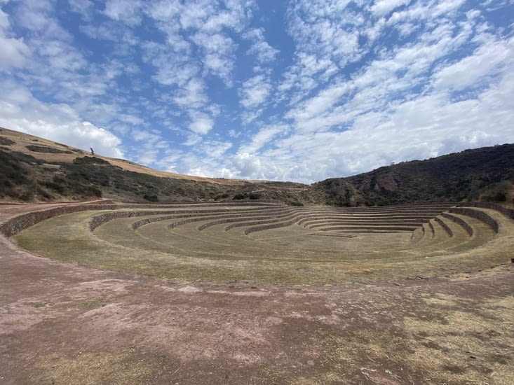 On file ensuite vers Moray, connu pour être le laboratoire d’agriculture des Incas. Les différentes terrasses auraient différentes températures et humidité selon leur niveau. L’endroit est également rapidement parcouru mais nous sommes impressionnés par l’ingéniosité des Incas une fois encore. Le lieu doit être encore plus beau après la saison des pluies.