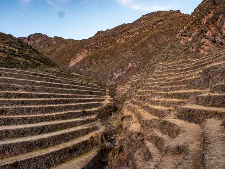 On file ensuite à Pisac avec un changement de collectivité à Urubamba. Après un délicieux repas dans un cadre un peu bohème et un incroyable éclair au chocolat, nous prenons un taxi pour rejoindre les ruines en hauteur de la ville. C’est ici que nous nous prendrons la plus grosse claque de la Vallée Sacrée. Cette fois, nous pouvons admirer de gigantesques terrasses concentriques sur tout le flanc de la montagne. En fin de journée, nous ressentons les fortes bourrasques de vent et nous nous baladons d’abord dans la petite cité du lieu que l’on peut arpenter librement.