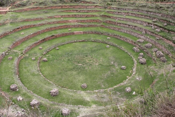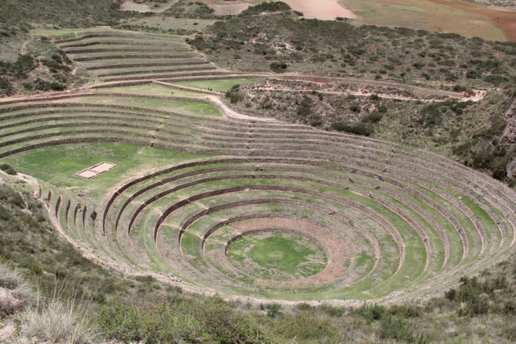 Moray : non, ce ne sont pas des extra-terrestres qui ont fait ça mais bien les incas ! Le site de Moray est une expérimentation agricole visant à créer différents microclimats (une vingtaine). Des terrasses disposées en cercle où plus on s'approche du centre, plus la températures est élevée. Et c'est comme ça que la coca pouvait être récoltée à 3500 m d'altitude...
