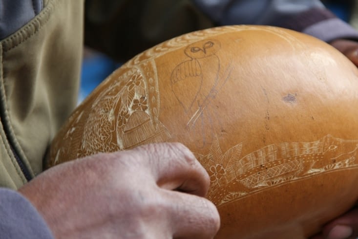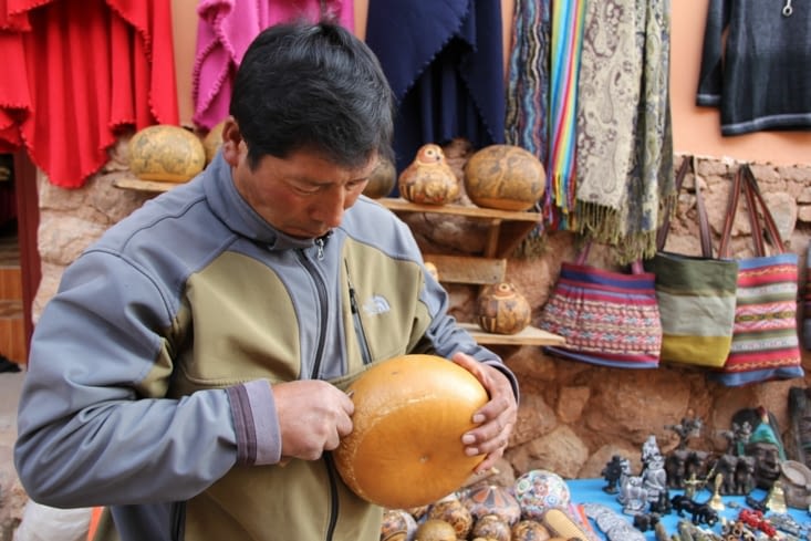 Là-bas, nous visitons les ruines (moins impressionnantes que le Machu Picchu ou Ollantaytambo mais tout de même sympathiques). Puis nous déambulons entre le marché et les ateliers de confection d'artisanat. Une petite fille tisse l'alpaga avec sa maman, un homme réalise des gravures sur des calebasses évidées... On s'est pas mal lâché sur les souvenirs ce jour-là (un bonnet pour mamy, des chaussettes pour papa et Fanny a craqué pour les calebasses. L'artisan a même finiolé la conception de son chef-d'oeuvre devant nos yeux émerveillés.