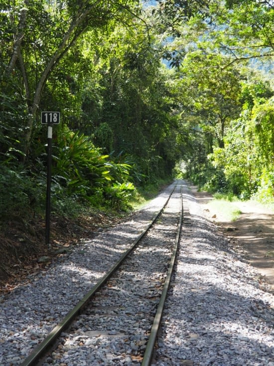 Il existe un chemin de fer qui longe la rivière, à l'intérieur du parc archéologique du Machu Picchu. Il est utilisé pour les pressés venant directement de Cusco ou d'une autre gare de la vallée sacrée. Nous nous faisons déposer à l'entrée du parc (à la nouvelle centrale hydroélectrique) par un mini-van où nous pouvons débuter notre marche. Nous longeons ces rails durant plusieurs heures, au coeur de la jungle, jusqu'à Agua Calientes.