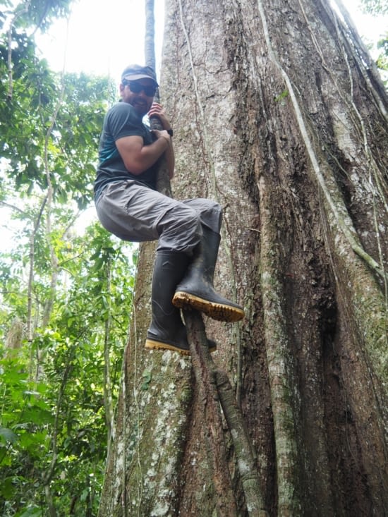 Moises nous montre de nombreuses plantes : certaines utilisées par les shamans, d’autres pour des raisons médicinales, ou bien encore d’autres pour faire des bateaux. Il nous indique alors que dans la jungle, un homme bon à marier doit savoir pêcher, chasser, trouver des fruits et grimper aux arbres. De façon amusante, nous entamons ce que nous appelons entre nous le Jungle Challenge : tout au long de la sortie, nous nous essayerons à toute sorte de jeux d’aventuriers : grimper aux lianes, couper des branches à la machette, grimper aux troncs des fameux Naked Trees (très glissants car pas d’écorce) ou bien se balancer aux lianes comme Tarzan le ferait.