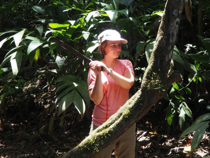 Equipés comme des vrais aventuriers, bottes étanches et machette affûtée (mais sans poncho de pluie, car dans la jungle il ne pleut jamais, c’est bien connu), nous partons en petite rando au coeur de la jungle : Moises à plein de choses à nous montrer.