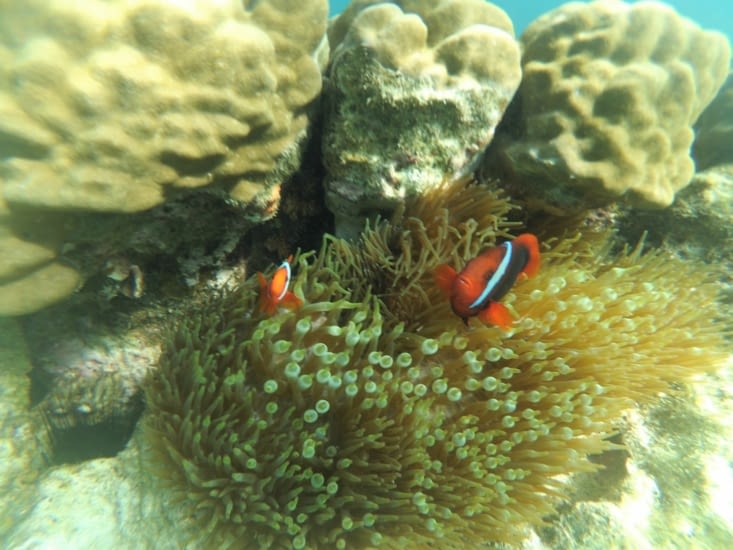 Commençons par la plongée, une nouvelle fois incroyable malgré une visibilité correcte mais pas optimale (environ 10 mètres). Un véritable aquarium par endroit, où nager au-dessus de gigantesques coraux roses dans des immenses bancs de poissons multicolores fut une de mes plus belles expériences sous l’eau jusqu’à présent. Mais il y a également eu des raies (à pois bleus), mon premier serpent de mer que j'ai observé de très très près (assez intimidant) et un banc lui aussi impressionnant de barracudas. En gros encore 3 plongées mémorables. Emilie s’est aussi régalée en snorkeling à observer cette faune abondante.