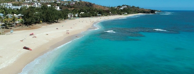 au loin, la falaise du Cap Homard, ainsi que la longue plage sans barrière de corail. Venez apprécier les nuances turquoises de l’océan et profiter pleinement de ce cadre propice à la détente, au bronzage et aux sports de plage tels que le beach tennis et le beach volley, vous avez aussi accès à un spot wifi gratuit.