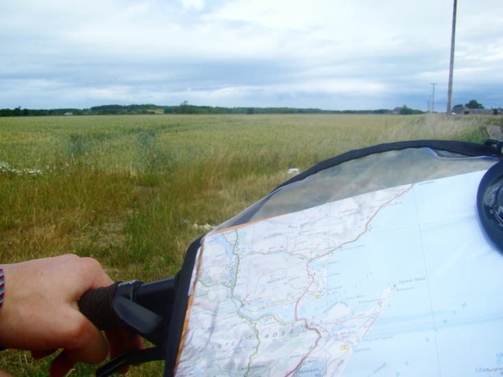 Petite randonnée en VTT pour se dégourdir les jambes; armés d'une carte et d'une boussole, nous explorons les villages alentours, soumis à la météo lunatique de l’Écosse.