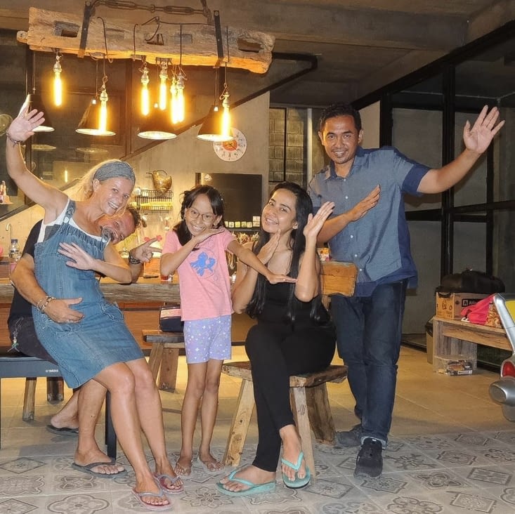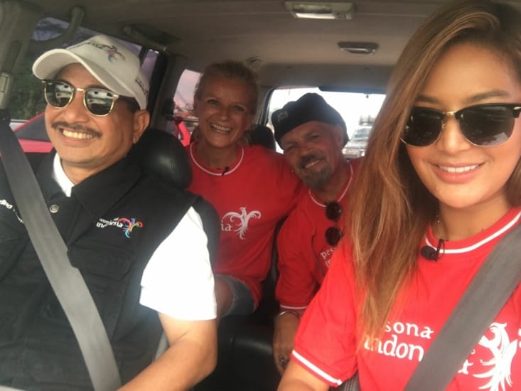On décide d’aller faire la révision et la réparation de la boite de vitesse de notre Zebramobile dans un garage de Balikpapan (Indonésie). Toni, le propriétaire (Indonésien Chinois) souhaite nous faire découvrir la spécialité de Kalimantan … Le crabe, mais pas n’importe où ! Le restaurant le plus connu en Indonésie : « Dandito Restoran ». C’est l’adresse favorite de nombreuses personnalités comme Jokowi (Président d’Indonesie) ou des stars de la télévision et de la chanson. A 20€ l’assiette cela se mérite ! Une fois arrivés, effectivement c’est plein (100 personnes environ) et des photos partout du proprio avec des VIP. La curiosité aidant, Philippe aperçoit le propriétaire des lieux, son look l’interpelle (Chapeau, lunettes façon Zanini … Jazzman Français). On décide d’aller l’interpeller … C’est Rudy… Affable, souriant, musicien, chanteur et surtout amoureux de la France (Surtout le Moulin Rouge et les Folies Bergère !!!). Il a monté une boulangerie – patisserie à côté de son restaurant qu’il a appelé « Boulangerie Parisienne ». Visite des lieux, cigare offert, nous voila partis dans une discussion pleine de surprises. Il nous propose son hospitalité pour les quelques jours de notre séjour sur Balikpapan. On restera chez lui plus d’un mois !!!! Promesse tenue … le lendemain il nous installe dans une de ses chambres d’amis. Durant ce séjour, le petit déjeuner (Avec croissants!), le déjeuner et dîner nous serons offert gracieusement tous les jours … Avec sa fille Gifta (25 ans) il va nous faire découvrir la ville et les alentours (Crocodiles, Orangs -Outans, Ours et Tribu des Dayaks). On passera au marché local et …. repartirons couvert de cadeaux locaux (Vêtements, bijoux etc). Mais au-delà de cette hospitalité, de cette gentillesse ce qui nous marquera c’est son histoire personnelle et l’absence de son épouse au début ! Rudy, issu d’une famille très pauvre, s’est fait tout seul … Il a commencé, adolescent, a travaillé dans la rue avec une carriole pour vendre du riz et autres. Les gens l’ont aidé à ses débuts (Crédit sur le riz, etc). Des années plus tard, après avoir écumé mille petits métiers, il a l’idée de monter son restaurant de crabe, le « Dandito ». Le succès est au rdv, plus que cela même. il va se faire connaître de toute l’Indonésie (Boulangerie a Bali, Steak House a Bandung). Une rue porte même son nom dans la ville. Il est respecté et aimé de tous. Il va profiter de sa réussite pour assouvir ses passions (Voyage, delta plane, collection de chapeaux mais surtout musique). Ce qui nous a plu, jamais il n’a oublié d’où il venait … il aide des locaux à créer leur business, monte et entretient un orphelinat Musulman, aide la ville pour aménager l’esplanade de la plage etc. Plus que l’argent, c’est les rencontres et les émotions qu’il recherche … et c’est cela qui nous parle ! Son carnet d’adresses est énorme … sa fierté est visible … mais pas d’arrogance ! Son restaurant, c’est un personnel d’environ 80 personnes … tous jeunes et de toutes confessions (Chrétien, Hindou et Musulman). Mais ce qui est fascinant c’est le respect et l’amour que lui portent tous ces jeunes. Un bonjour « Daddy » tous les matins ! Oui c’est comme un père protecteur où il fait bon de travailler (Rires et rigueur sont de mises). Pour tout le monde et tous les jours nous sommes ceux dont il faut prendre soin … que de souvenirs avec tous ces jeunes, à la fois curieux et respectueux. Boycke et Rully, musiciens (Guitariste et Pianiste) assurent la musique toute la soirée (Rock, Jazz …) avec comme Guest, Rudy au Saxo, au Banjo et au Chant, Eva va profiter de cette opportunité pour chanter avec eux … à la demande générale il lui faut travailler son répertoire Français (Édith Piaf et Yves Montant par exemple). Inutile de décrire ma fierté, de les voir tous ensemble sur l’estrade ! Pour mon compte ce sera football avec les amis de Gifta et de son frère Dandy … plus bières ! A la demande de Gifta et Rudy nous allons passé une semaine chez Dandy à Bandung (Java) pour découvrir son restaurant Steak House. On a adoré cette ville, jeune et créative. Encore une fois ce sera musique, concerts, rencontres artistiques et … bières ! Que de monde rencontré, depuis un mois grâce au charisme de Rudy … Le deuxième sujet qui nous aura marqué est d’un tout autre genre … c’est l'épouse de Rudy : Juli. Au début très discrète, très peu présente ... cela nous interpelle et nous embarrasse. Peut être que notre présence la dérange. Rudy nous explique qu’en tant que jeune couple, la religion avait peu de place. Le temps passé, elle est devenue plus proche de l’Islam dans l’approche de sa vie. Sa pratique, ses tenues et sa discrétion sont de mises. Mais il nous explique qu’elle craint la vue des Européens, car parfois dans le restaurant, le regard était différent par ceux qui fréquentaient Rudy. Un certain malaise nous emporte. Que faire ? Il nous propose de se rencontrer dans leur maison secondaire et nous suggère de la rassurer en expliquant nos bonnes intentions et en insistant sur notre tolérance et respect de l’Islam. C’est en racontant nos longues et belles histoires sur des rencontres en Turquie, en Iran, en Malaisie et surtout en Indonésie que l’on a découvert une femme pleine de quiétude, de tolérance et de bonté. Ce ne sera pas la première fois qu’une telle sensation nous chavirera … C’est vrai qu’une différence apparaît entre Rudy et son épouse. Mais pour des raisons différentes nous les avons aimé de la même manière. Rudy est devenu comme un frère pour moi et Juli est devenu comme une sœur pour Eva. A la surprise de tous (Surtout pour Rudy et leurs enfants) voilà qu’Eva et Juli chantent le soir après la fermeture du restaurant. Pire encore c’est