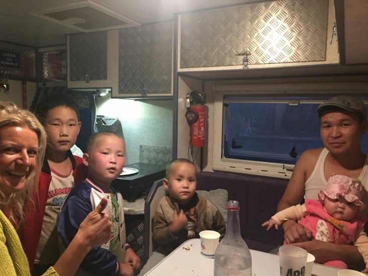 Nous décidons de les prendre avec nous.Il s’agit de Alex et Nastya.Le projet n’est pas clair … Ils se rendent en Mongolie dans un premier temps et ensuite ils verront.Rapidement une impression bizarre nous envahi. Leur départ semble précipité : peu d’affaire, pas d’argent ! D’autant qu’ils sont très jeune (moins de 20 ans) et que Nastya est légèrement handicapé au niveau dupied droit.Les réponses à nos questions ne sont pas très claires … d’autant que leur Anglais est approximatif !Notre impression et qu’ils sont plutôt en fugue …Peu importe, leur situation précaire nous touche. Arrivée trop tard à la frontière Russe, nous décidons de bivouaquer quelques kms avant la douane.Ils ont une petite tente et deux duvets. Le lendemain matin nous les apercevons prendre leur petit déjeuner … plus que sommaire (eau + céréale!).Nous les invitons à notre table pour prendre un vrai café, du pain et de la confiture …Leurs sourires en dit long …Nous passons la frontière ensemble et c’est la que nos doutes prennent plus de sens …Arrivée en Mongolie, ils explosent de joie ! Comme si c’était une libération.Nous n’en serons jamais plus …Mais avant de se quitter nous decidons d’aller faire le plein de course. Nous allons en profiter pour leur acheter l’essentiel de nourriture pour quelques jours.C’est avec gêne mais bonheur qu’ils nous remercient …