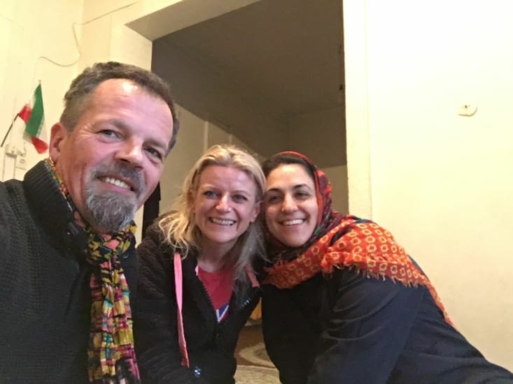 Pendant ce temps, l’ingénieur détecte plusieurs pannes (fissure sur le carter, problèmes sur la carte mère et un des 2 brûleurs). Cela prend du temps et Sina se propose de nous héberger durant les travaux. Mais la réparation se complique et donc ce n’est pas une journée mais plusieurs jours qu’il faudra. En attendant on sera hébergés comme des «rois». Repas spécial, chambre spéciale, activités, présentation de toute la famille etc. Leila, la maman de Sina, et Eva deviennent de vraies complices (sport, repas, shopping, cours d’Anglais …). L’amitié et la complicité s’installent jours après jours. Cela nous permet de voir la vie au quotidien d’une famille typiquement Iranienne, qui regrette l’époque du Shah d’Iran (Comme de nombreux Iraniens !!). Sina en profite pour se confier à nous … il vit son oppression Iranienne de manière plus forte que ses amis … son homosexualité (visible), ajouté a son envie de liberté engendre chez lui l’obligation de quitter le pays. Sa maman nous demande souvent notre avis !Nous sommes bien embêté face a ses questions … Le problème des jeunes Iranien c’est qu’il se fond une idée de l’occident, voir des États Unis bien trop édulcorée … pour résumé l’occident c’est la richesse et la liberté ! Quand nous leurs expliquons qu’il y a aussi du racisme, du chômage, des sans abris, de l’injustice etc, ils refusent de l’entendre. Pour eux, le monde occidental c’est plus celui des clips musicaux Américains, voir du cinéma de Brigitte Bardot, Belmondo et Delon.Voir cette génération attendre et espérer que les Américains viennent a leur secours … nous attriste !On connaît la réalité ! l’Irak, la Libye en sont des preuves. Nous nous efforcont de les convaincre que leur salut ne peut exister que grâce a cette nouvelle génération. Un souffle de renouveau existe et il faut le poursuivre, aux risques des nombreux morts qui deviendront des martyrs …Mais surtout de ne rien attendre des États Étrangers. Pour revenir sur ce séjour de plusieurs jours dans la famille de Sina, une chose nous aura marquée !3 generations (Sina, sa maman et sa grand mère) avec des vécus et des opinions complètement paradoxales.Sina (environ 20 ans) : en rejet complet de son pays et de l’Islam avec des rêves de « pseudo modernité occidentale »Sa maman (environ 45 ans) : en lien complet avec l’Iran d’aujourd’hui. Très croyante et pratiquante. En respect avec la mémoire de l’Ayatollah Khomeini (elle n’a pas de souvenir de l’epoque du Shah) Sa grand mère (environ 65 ans) : en rejet complet de l’Iran d’aujourd’hui, croyante et pratiquante mais sans exes, mais surtout en regret de l’Iran du Shah qu’elle décrit comme une époque plus libre et moderne.En conclusion, une maman tiraillée entre l’envie d’un ailleurs de son fils et le passé embellie de sa mère. Les larmes ont coulées quand nous nous sommes tous quittés mais avec l’espoir que leur avenir s’embellira grâce a la nouvelle génération qui n’est ni dans le passé, ni dans le présent