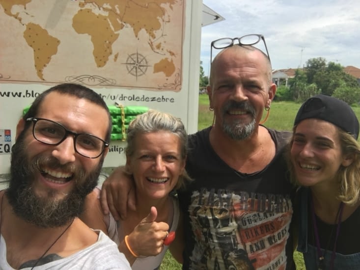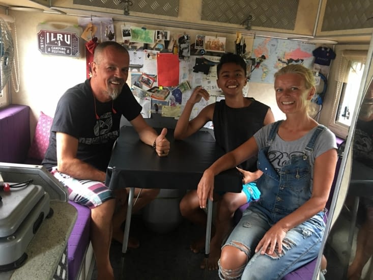 Hier, alors que nous nous ouvrions vers le port pour aller acheter des billets de ferry pour l'Indonésie, vers l'heure d déjeuner nous avons remarqué, garé dans un parc près de notre guest house, un camping-car 4 x4, chose très étrange par ces parties . À l'arrière, il y avait une gigantesque carte du monde, et nos yeux se sont penchés sur la route tracée sur elle. En baissant le regard, on a remarqué la plaque française. Par la fenêtre nous voyons un monsieur au visage sympathique qui nous salue et nous invite à entrer ensemble à sa femme, sur le seuil de la "maison". ? ❤️ ?