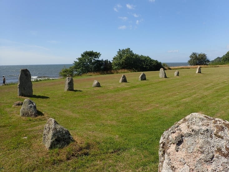 Le premier est à Smygehuk. 55°20’13’’ de latitude nord, 13°21’34’’ de longitude ouest, c’est le point le plus méridional de la Suède. Son petit port n’est pas sans rappeler Port Racine et le site est bien aménagé. Véro avise une saurisserie qui hélas n’ouvre qu’à 10 heures… Tant pis. D’autant que nous avons trouvé une autre quelques kilomètres plus loin…Il nous y a deux ans, nous étions passés à Skagen, le lieu magique où se rencontrent Mer du Nord et Mer Baltique, le point le plus au nord du Danemark. Bray-Dunes, le point le plus septentrional de la France nous est familier, tout comme De Panne, le point le plus occidental de la Belgique, sans parler bien sûr d’Ouessant l’île qui nous est si chère… Ça commence à nous faire une petite collection.Quelques kilomètres avant d’arriver à Ystad, nous faisons une petite pause à Svarte pour admirer Disas Tin, un cercle de pierres qui marque le lieu d’une sépulture du début de l’âge de fer, à moins qu’elle ne remonte au néolithique, les avis divergent…Nous arrivons enfin à Ystad, une petite ville magnifique avec ses rues aux façades colorées, ses roses trémières.Elle est connue pour être la ville du Commissaire Wallander, le héros des romans d’Henning Mankell. Il réside au 10 Mariagatan, nous y jetons un œil. C’est un immeuble tout à fait quelconque, ce qui correspond bien au personnage, L’homme on le sait est un anti-héros, désabusé : « La Suède (est) devenu(e) un pays où les portes fermées (deviennent) de plus en plus nombreuses » déplore-t-il. La Suède ? Tiens donc !