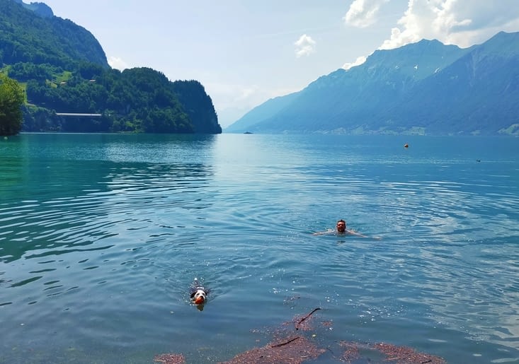 Une fois en bas, je n'ai pas résisté à aller piquer une tête, ça fait vraiment du bien, ça délasse et ça décrasse! Bucky aussi était ravi de se rafraîchir!