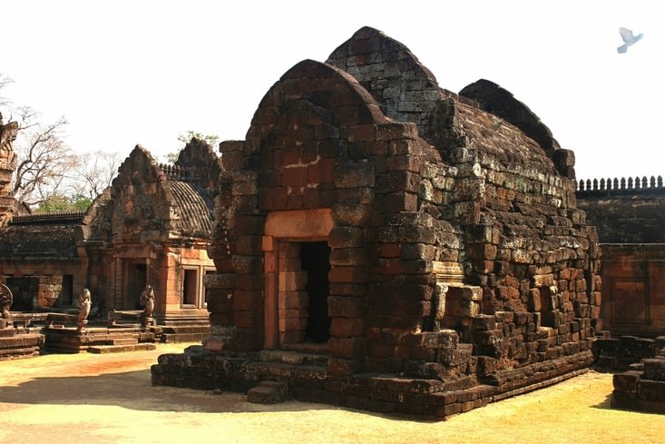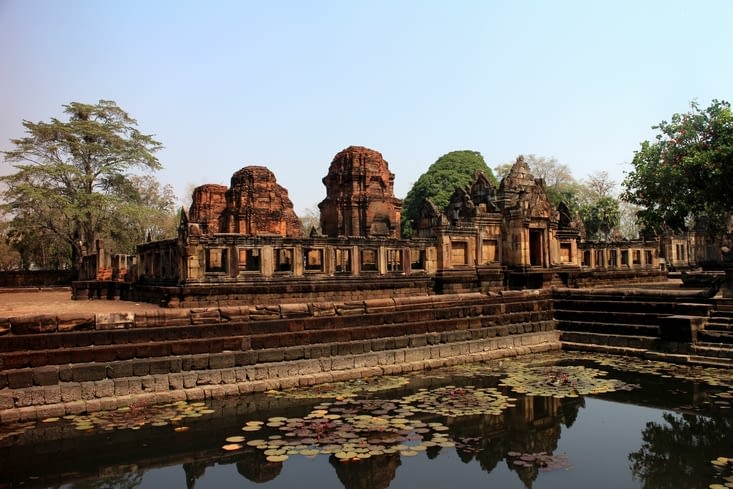 Le deuxième temple, le Prasat Muang Tam, bâti au Xe siècle et situé à une dizaine de km est très différent. Il est bâti sur un plan carré. A l'intérieur de ce carré, 5 stupas de brique assez ruinés. Le temple est encadré par 4 bassins en forme de L dont l'un est fleuri de superbes nénuphars. Il y a ici beaucoup moins de monde qu'au Phanom Rung. J'avoue que ce temple est mon préféré.