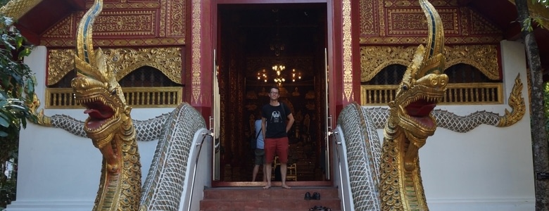 Le Wat Doi Ngam Muang est en haut d'une petite butte, il y a des colonnes taillées dans des troncs de cocotier assez impressionnantes. Petite mésaventure là bas: le temple presque désert, nous décidâmes de faire le tour du bâtiment. A l'arrière des chiens commencent à nous aboyer dessus, nous flippons! Ils s'en prennent à Nathan et montrent les crocs... Un thaïlandais aide Nathan à les faire fuir. Nos jambes tremblent, même si rien de grave n'est arrivé et qu'il était peu probable qu'ils nous attaquent.