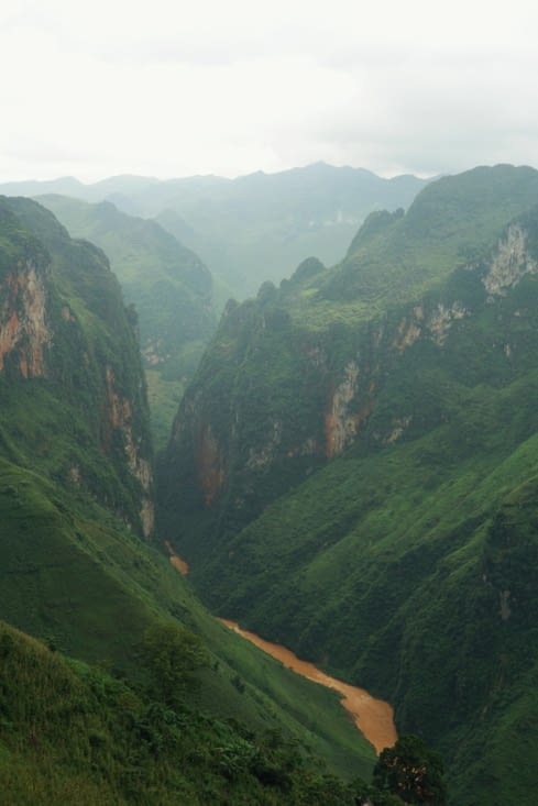 Jeudi 21 juillet, nous partons en direction de Meo Vac. Il s’agit de la partie de la route la plus impressionnante car elle suit le lit de la rivière en contrebas, ce qui forme une gorge. Nous nous arrêtons plusieurs fois pour faire des photos. La route est vraiment à flanc de montagne, sa construction a dû être un sacré chantier.