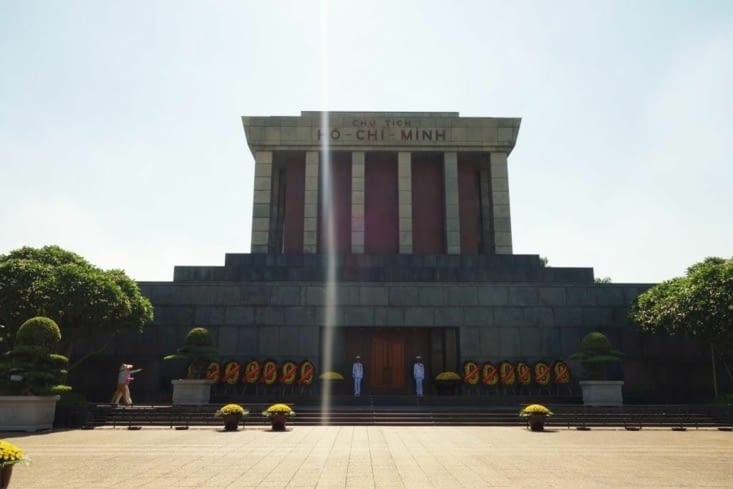 Mardi 26 juillet, nous allons au mausolée du vénéré Ho Chi Minh en fin de matinée, mais celui-ci est déjà fermé et nous reviendrons le lendemain matin pour la visite. Ho Chi Minh (littéralement "celui qui éclaire") fut et reste un homme très important pour les Vietnamiens. Il autoproclama l’indépendance du Vietnam en 1945, puis dirigeât la révolution qui aboutit à la victoire du Vietnam après la bataille de Dien Bien Phu. Il devint le premier président du (Nord) Vietnam, après la signature des accords d’indépendance à Genève et fit ensuite tout son possible pour la réunification du Vietnam. Cependant il ne verra pas la fin de la guerre contre les Américains puisqu’il meurt en 1969. Son corps (qui a été embaumé) est actuellement conservé à Hanoi dans un cercueil de verre et sa dépouille trône au milieu d’un mausolée qui peut accueillir une cinquantaine de personnes. Les photos sont interdites, il est également interdit de parler et de s’arrêter pendant la marche autour du cercueil. L’atmosphère est particulière, certains Vietnamiens ont les larmes aux yeux, d’autres se prosternent devant le corps.