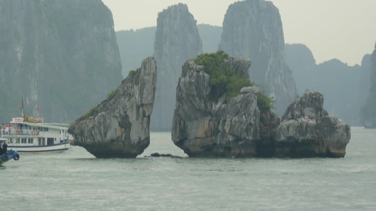 Une dernière anecdote en souvenir de notre guide formidable Nghi: lorsque nous randonnions avec lui il nous avait montré 2 rochers nommés le "combat des coqs", en nous disant "il y a les mêmes à Halong". Les voici: