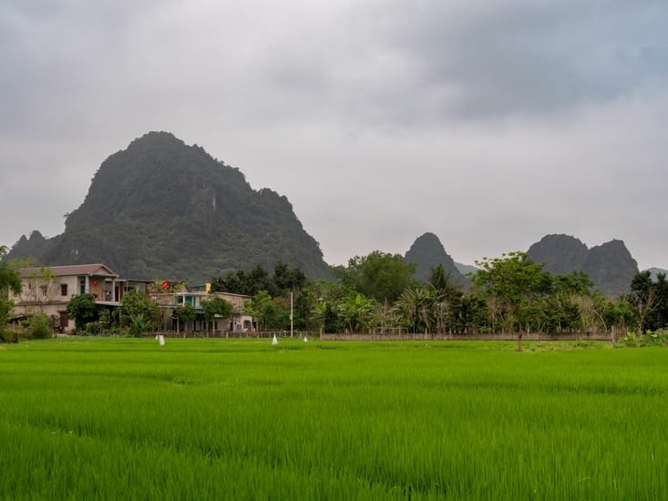 Le repas finit, nous repartons cette fois-ci en direction des rizières. Nous nous retrouvons alors seuls au milieu des rizières, encerclés par ces gigantesques pics karstiques. Nous nous sentons tout petits face à ce magnifique paysage. La faune est très présente et nous assistons au bal aérien de multiples oiseaux. L'œil aiguisé, Maelle aperçoit même un petit martin pêcheur à l'affût de sa future proie.