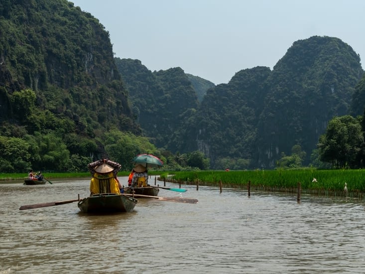 Celle-ci démarre à l’embarcadère de Tam Coc où nous prenons un ticket pour partir en barque à la découverte d’une partie de la « baie », qui est en fait un enchaînement de vallées où la frontière entre l’eau et la terre est peu perceptible. Ce secteur d’environ 2000 ha se compose de pains de sucre calcaire (similitude qu’elle partage avec sa légendaire grande sœur, la baie d’Ha Long), de rizières, de grottes et de temples. Il s’agit d’une importante réserve écologique et la région vit essentiellement de l’agriculture et du tourisme. Il faut dire que les paysages pittoresques sont à couper le souffle !