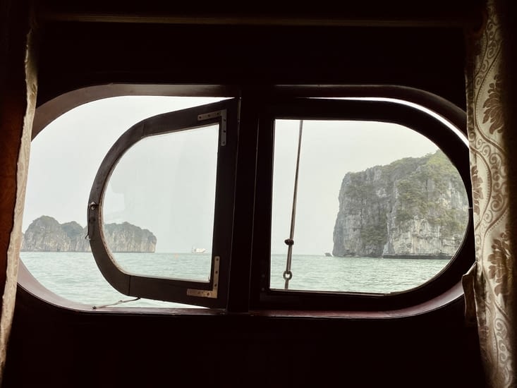Nous partons donc découvrir cette petite baie à bord de la jonque « 4 saisons », munie de quelques cabines seulement et d’un pont supérieur d’où nous pouvons apprécier le paysage. Au programme des deux jours : navigation, kayak de mer, baignade, balade à vélo vers un petit village isolé et farniente sur les transats du pont du bateau.