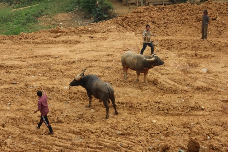 Lever à 6 H 30, pour le marché de Can Cau, non loin de la frontière chinoise. Je vais partager le taxi avec Stephen, un vieux baroudeur anglais très sympathique qui est descendu dans le même hôtel que moi et avec lequel je partagerai tous mes repas à l'hôtel La route de montagne doit être magnifique, mais à cette heure la visibilité est quasi nulle. Nous pourrons mieux en profiter au retour. Nous arrivons en une heure à peine, avant le flot des touristes qui viennent pour la plupart de Sapa. Le site est splendide et le marché tient ses promesses d’authenticité : quelques vendeuses d’artisanat, mais c’est supportable.On y trouve toutes sortes de denrées, mais c’est aussi une grande foire aux bestiaux : beaucoup de buffles (dont des buffles de combat aux cornes impressionnantes),